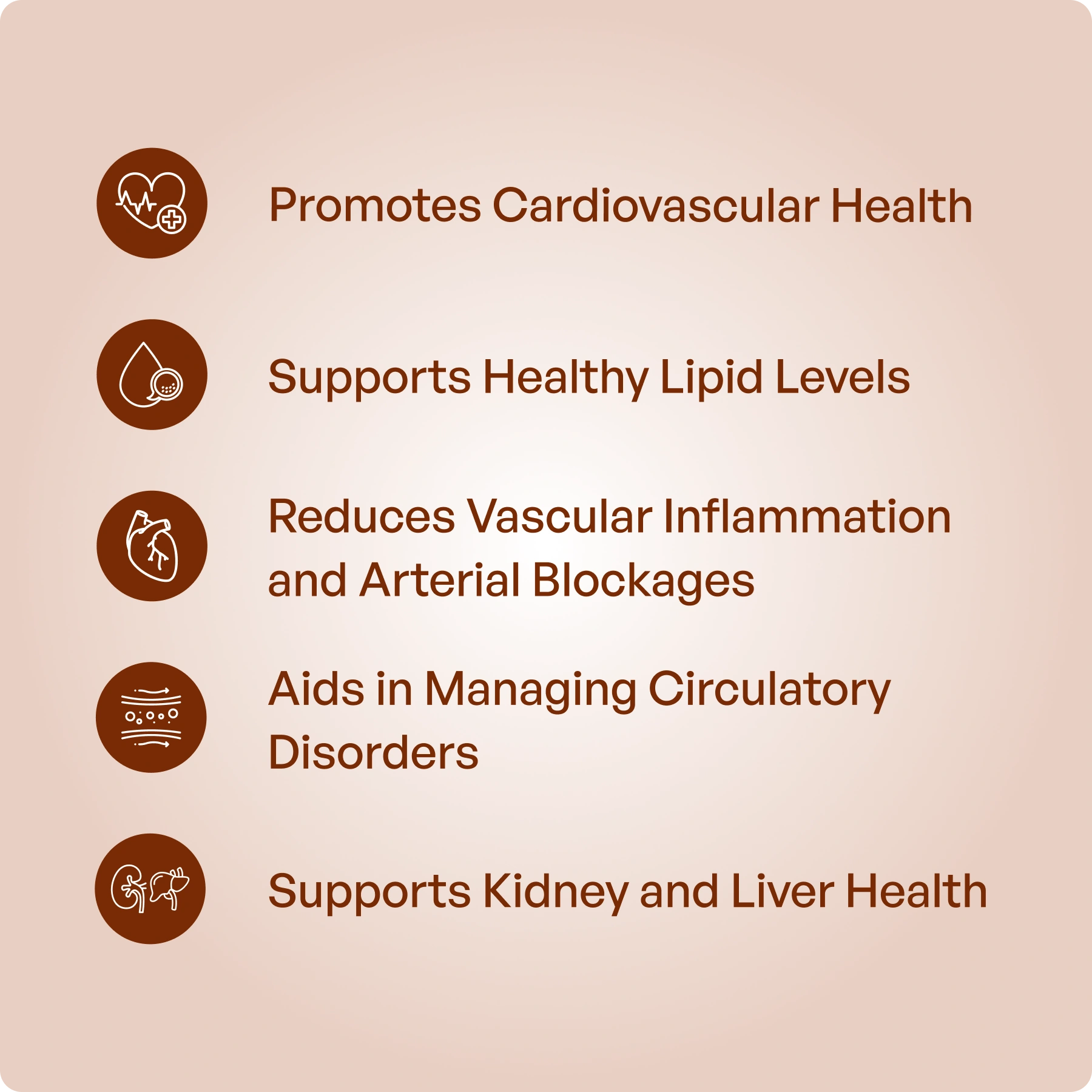 Great herbal support for heart health, lipid balance, and clear blood flow. Helps maintain BP, reduces blockage risk, and boosts overall cardiovascular wellness.