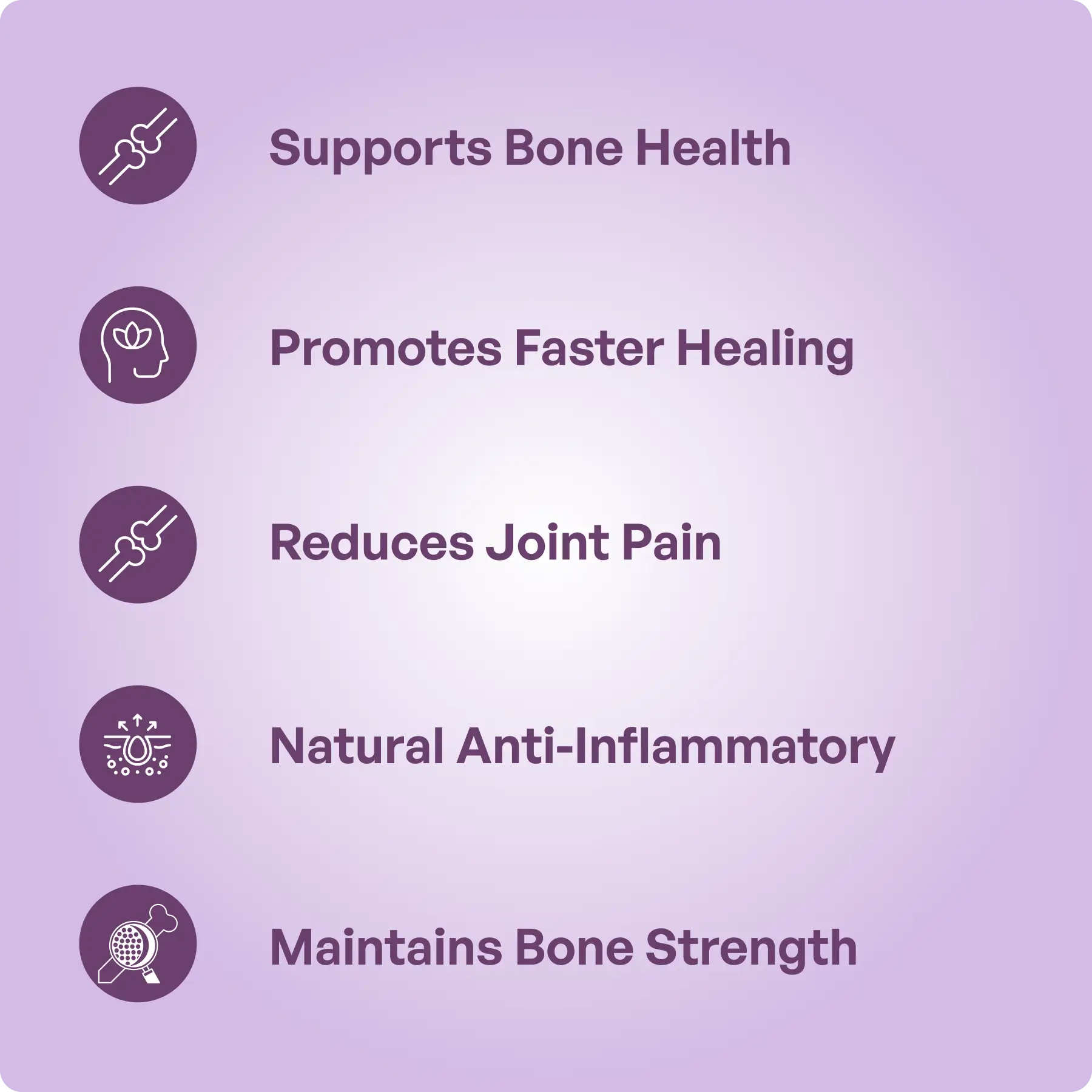 - Supports bone health by enhancing calcium absorption and bone regeneration