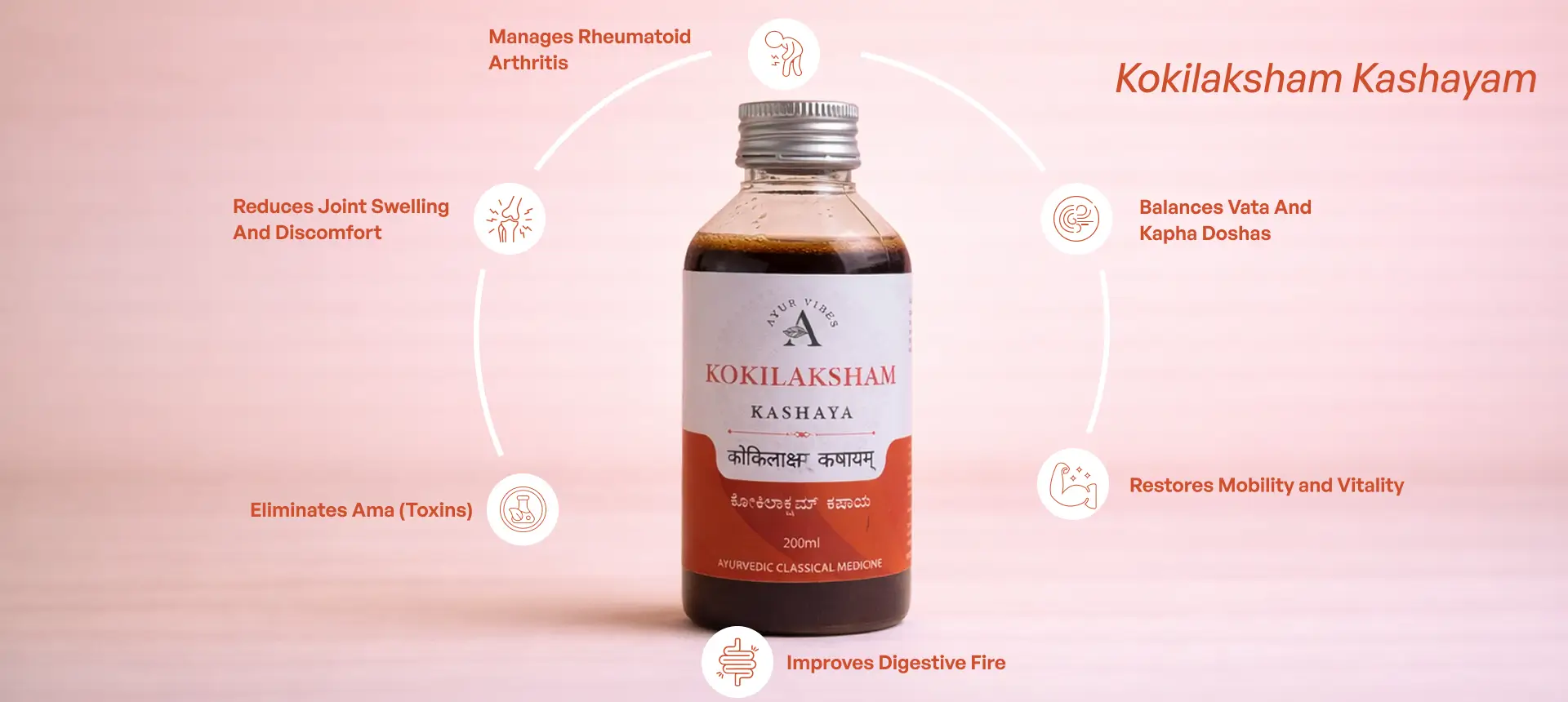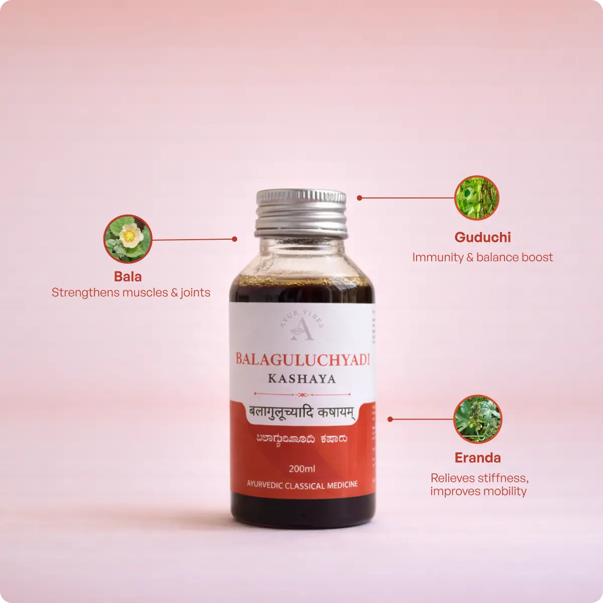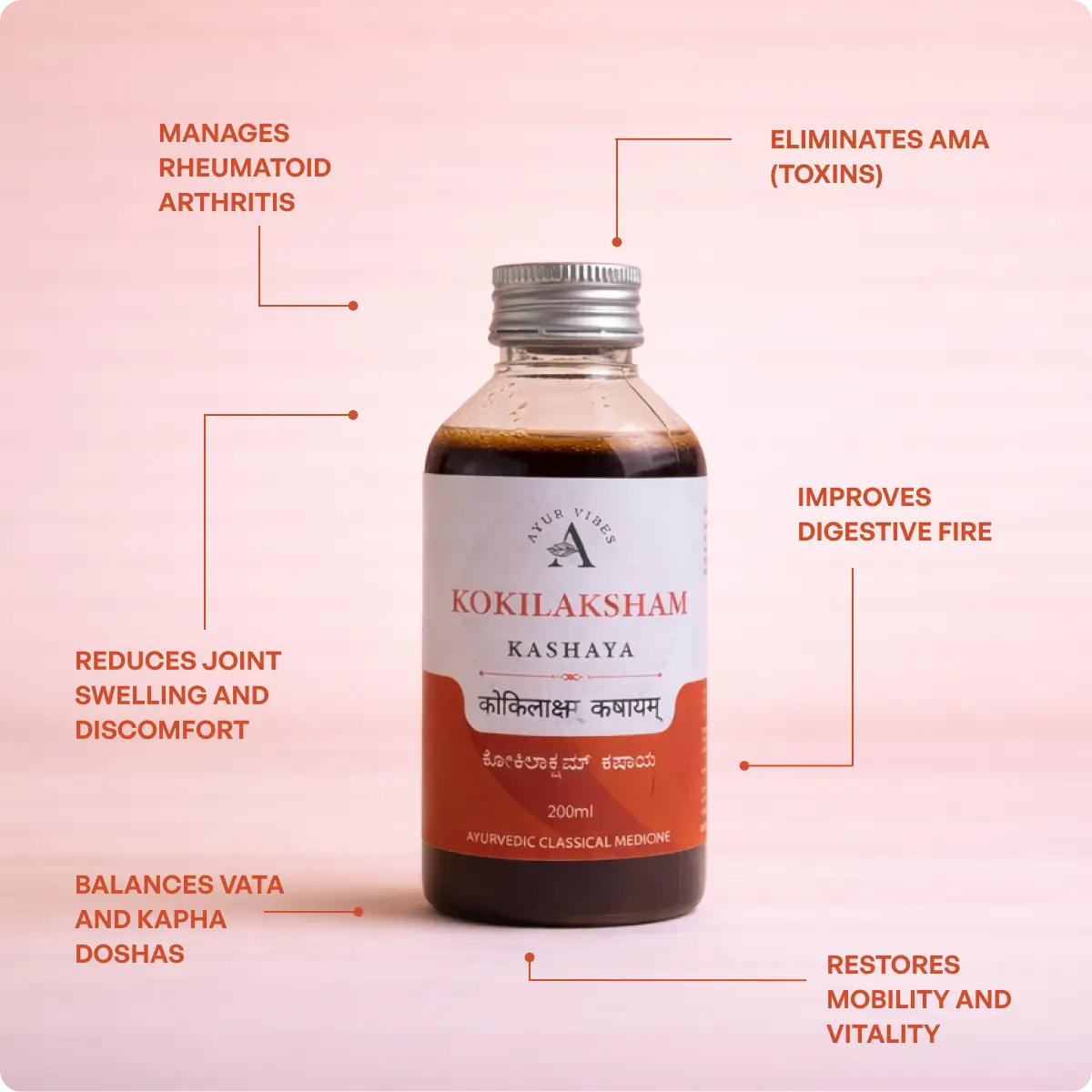 Pippali and Shunthi in this kashayam actively stimulate digestive fire and support the breakdown and elimination of Ama — the partially digested metabolic waste that accumulates in joints and tissues causing inflammation.