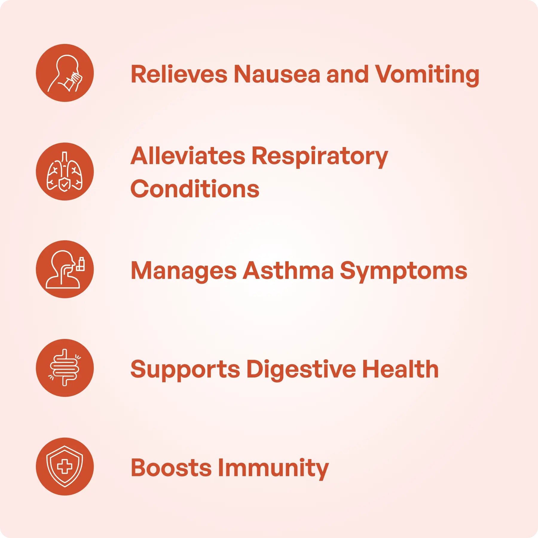 It is classically indicated for nausea, vomiting, cough, hiccups, and asthma. It also supports digestive health and helps manage Kapha-related respiratory conditions.