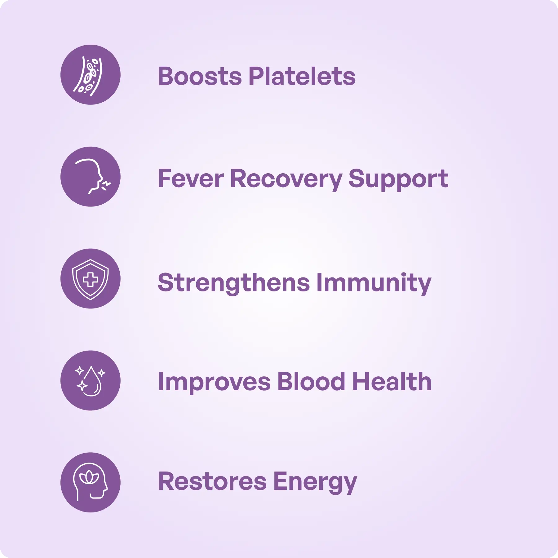 - Helps accelerate recovery from dengue fever, viral fever, malaria, and thrombocytopenia