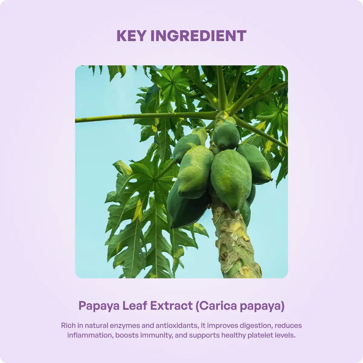 - Natural Ayurvedic formulation enriched with Papaya Leaf Extract to support healthy platelet levels