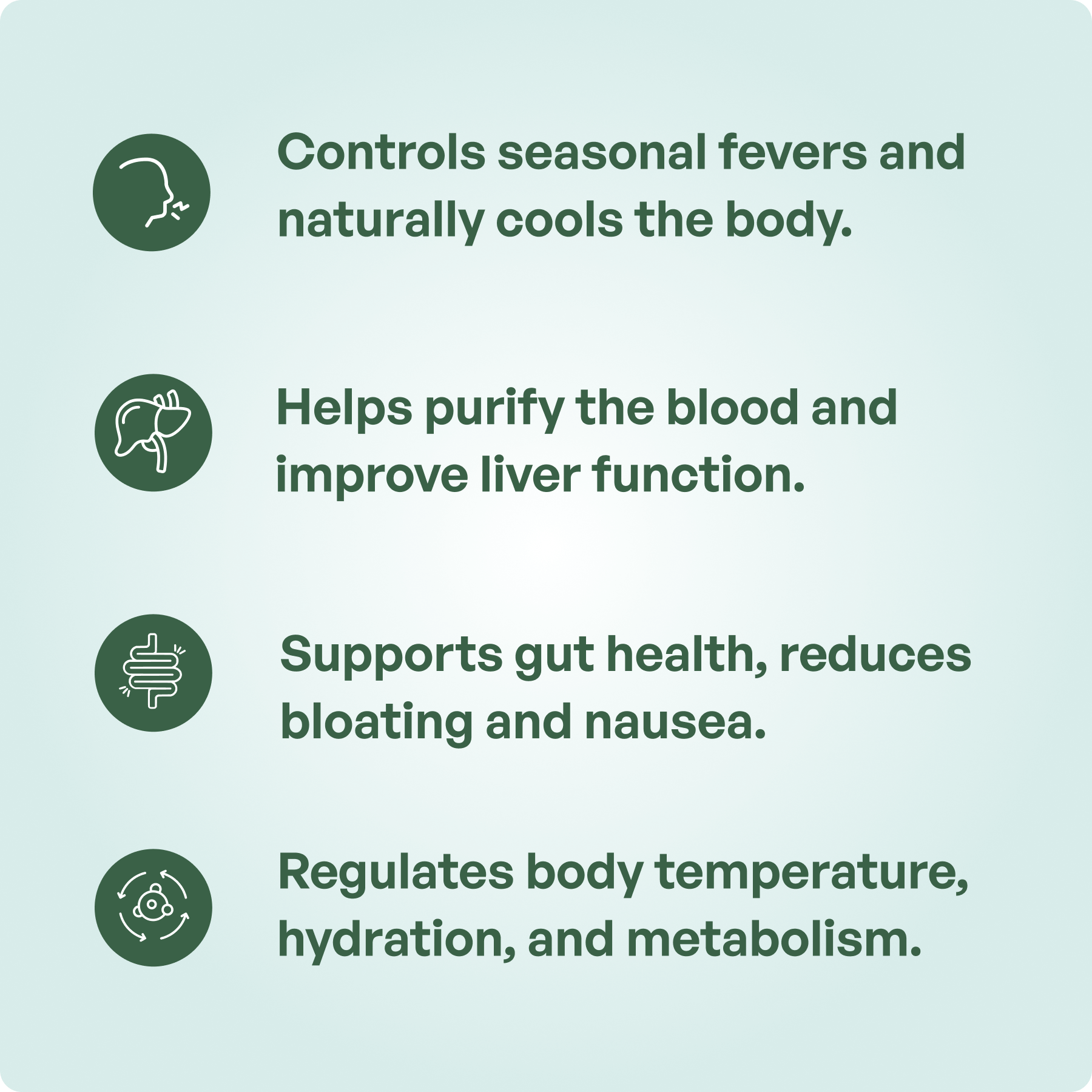 - Controls seasonal fevers and naturally cools the body.