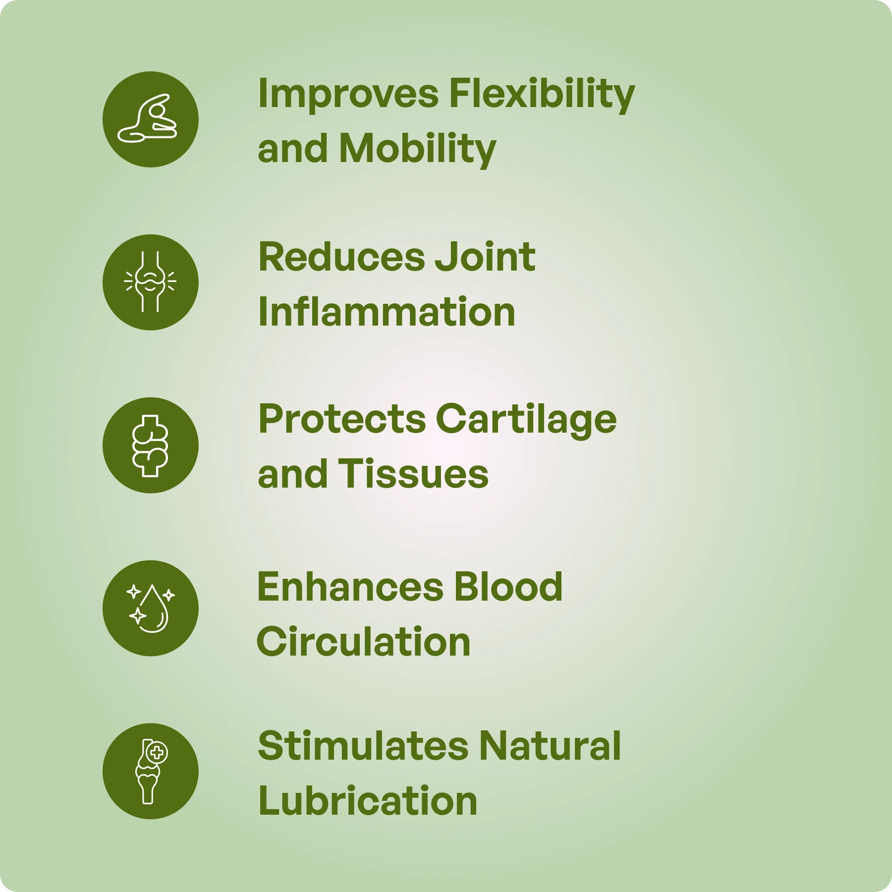 It helps reduce inflammation, supports cartilage health, and improves blood supply to joints, promoting smoother and pain-free movement.