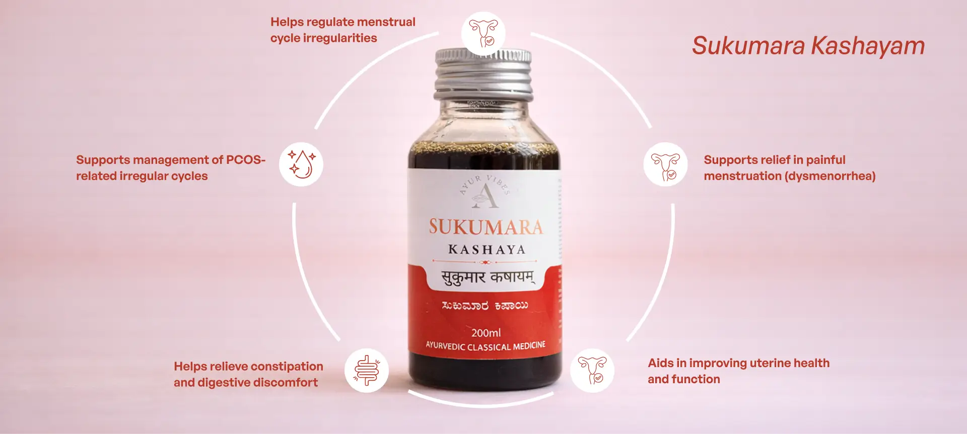 Sukumara Kashayam is a classical Ayurvedic formulation primarily indicated in women’s health conditions, especially menstrual disorders and digestive imbalances. It is traditionally used to support uterine health, regulate menstrual cycles, and relieve associated discomforts like abdominal pain and constipation.