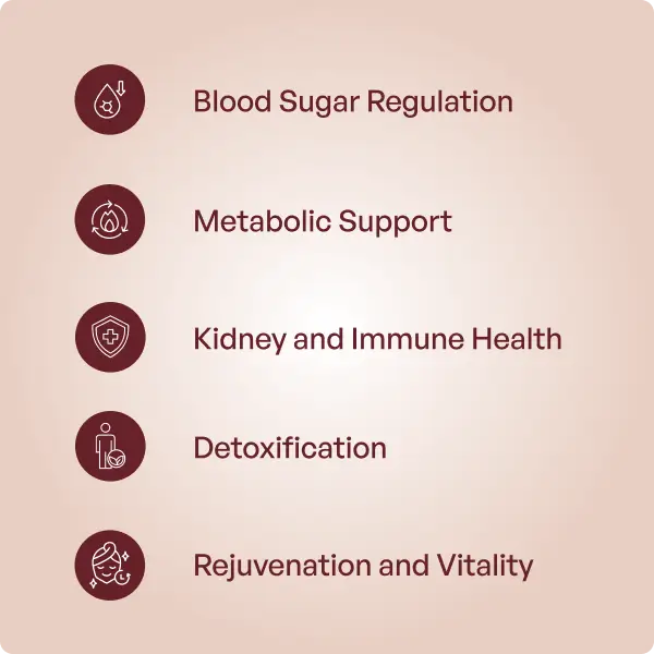 It supports blood sugar balance by improving insulin sensitivity, metabolism, and reducing diabetes-related complications such as fatigue and frequent urination.