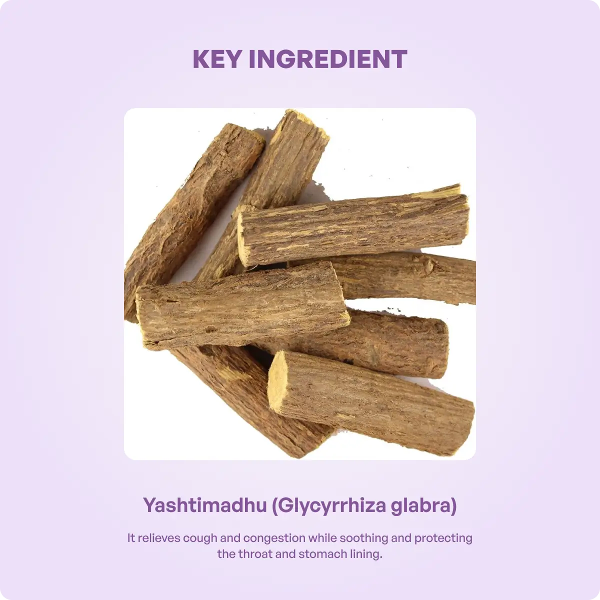 Yashtimadhu has natural demulcent properties that coat and soothe the throat, reducing irritation and cough.